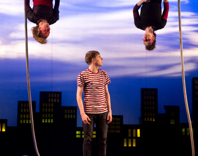 Niamh, who plays my Mam amongst a host of other characters in the show, was upstairs in the kitchen making industrial strength tea in an industrial sized teapot – enough for everyone to have a cup – and stealing us all some biscuits from The Ark’s ever dwindling supply. Elaine and Emily, the two aerialists, were dangling from the rafters somewhere overhead, just lounging there like cats. I was sitting on the side of the stage staring at my hands and thinking how funny it is that when I think of all that’s changed over the past month, the first thing that springs to mind are them. I have calluses on my hands now. Cool. I take a bizarre pride in that- as if these calluses are finally proof that theatre makers are a tough crowd, like lumberjacks or sailors. As if now, after all these years, theatre can take its rightful place beside shark fishing and bear wrestling. I joke, but it’s only really in looking at those calluses, and feeling the rough skin on my palms and fingers do I realise – gosh, this has been really tough work. It’s very easy to think that doing a play for young people is somehow going to be easier than a show ‘for adults’, but in reality the complete opposite is true. Far Away from Me is the first play I’ve done that has left each of its cast members with an assortment of bumps, bruises and scrapes to show for it, that leaves us sweating buckets at the end of each run. That’s left me with calluses on my hands. Happy calluses. Rewarding calluses. Calluses to be proud of. It’s a testament to Amy, our director, that she’s able to keep a handle on all of us. As we run, jump, and climb around the stage, Amy’s able to make sense of it all, and has mashed everything together- the lights, sound, aerial performers and actors- into what I think we can all believe is a pretty stellar show.